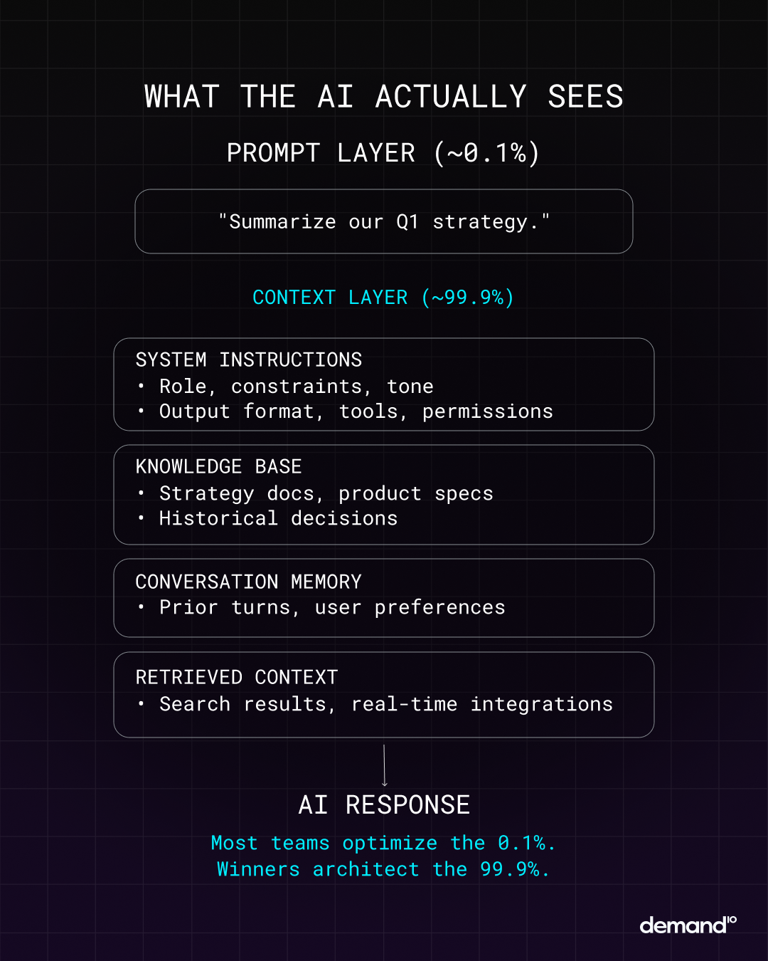 Most organizations are making the same mistake. They are treating AI as a better autocomplete when it is actually a fundamentally different substrate that operates under its own physics. The prompt is 0.1% of what the model perceives. The other 99.9% is context—and most teams are architecting it by accident, not by design.