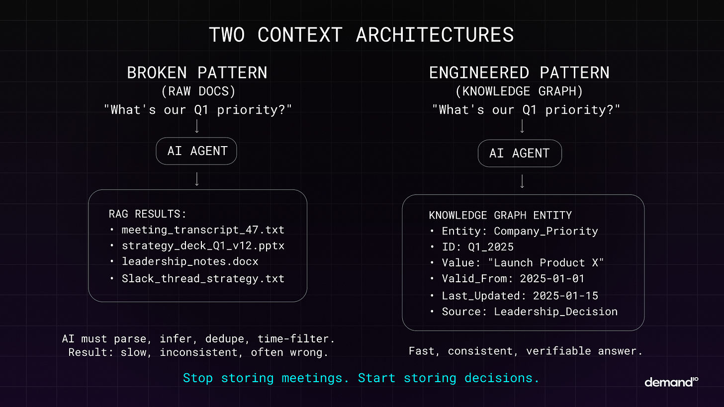 Stop storing meeting transcripts and slide decks as your source of truth. Translate your organizational knowledge into structured formats first: decision logs, entity relationships, versioned facts.