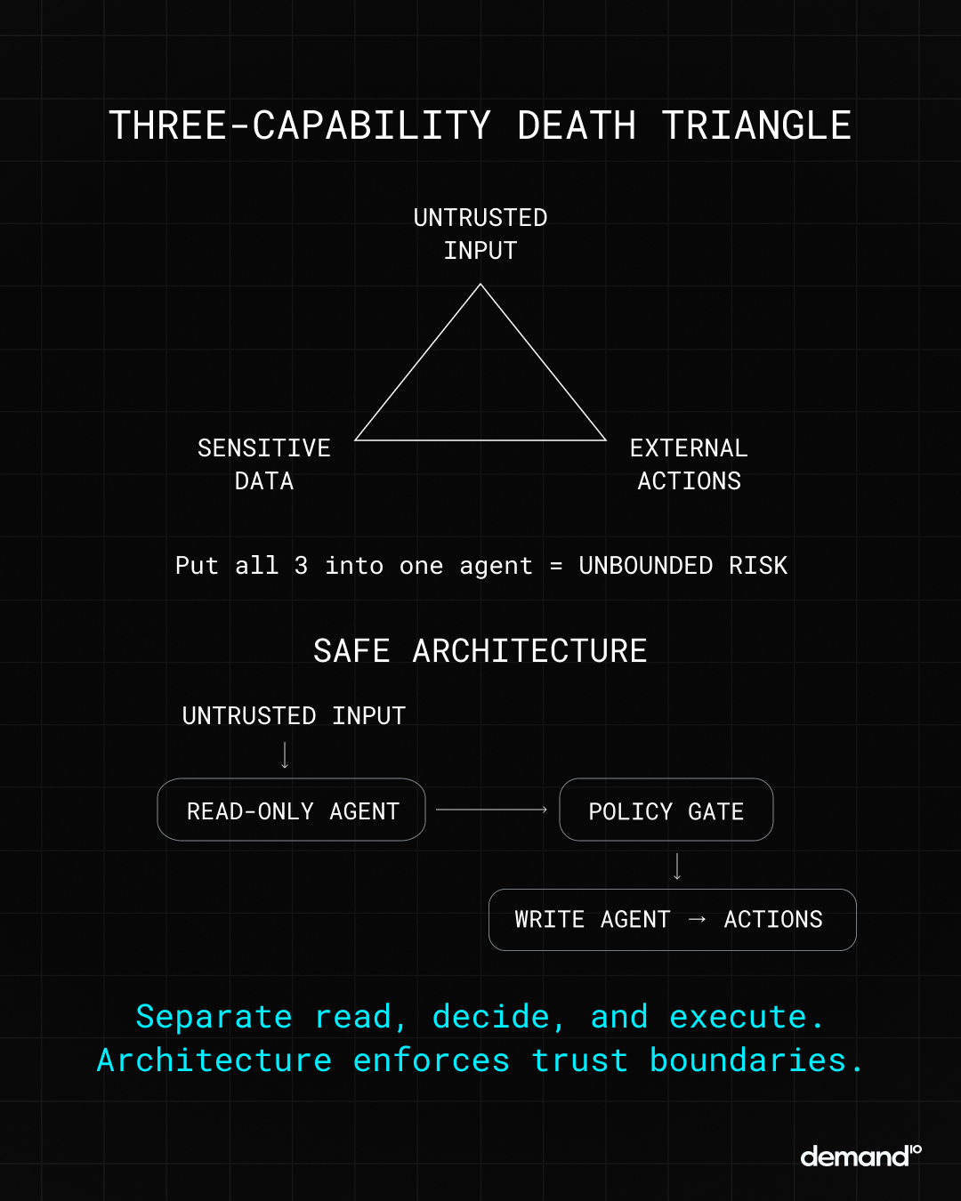 Any system that simultaneously processes (A) untrusted inputs (emails, user queries), has access to (B) sensitive data (database, customer info), and can take (C) external actions (send emails, trigger workflows) has unbounded risk.