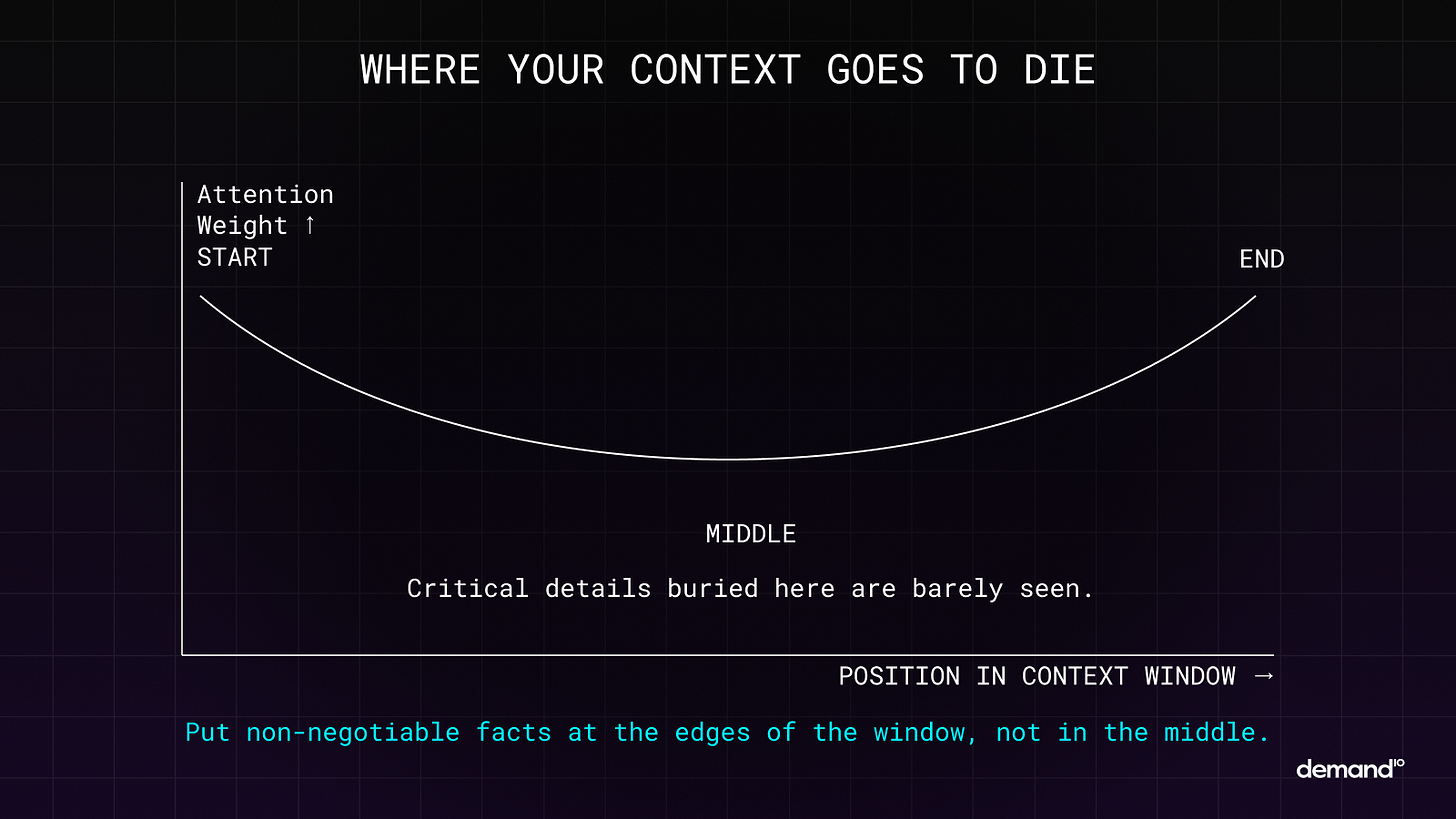 The AI’s context window is not a flat list where everything has equal weight. It is a U-shaped curve. Information at the very beginning (primacy) and very end (recency) gets the most attention. Information buried in the middle effectively becomes invisible.